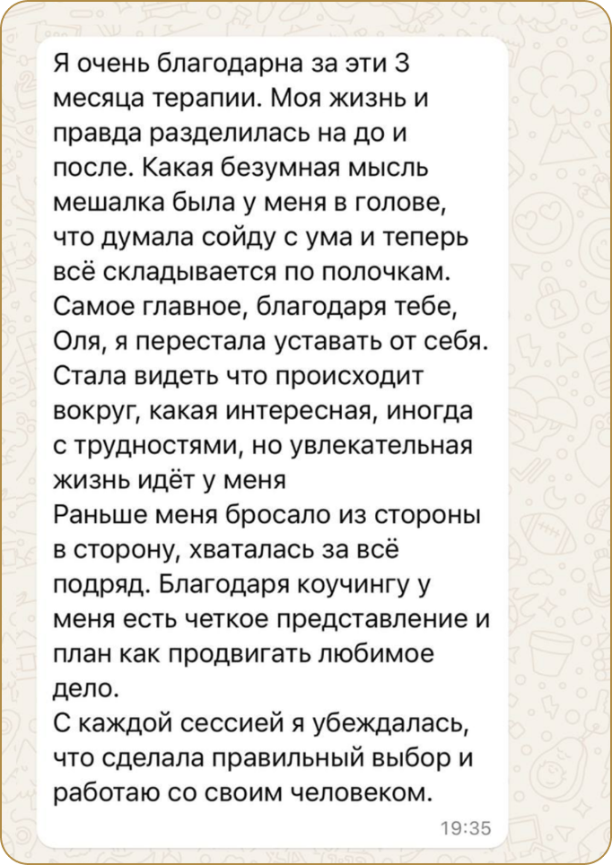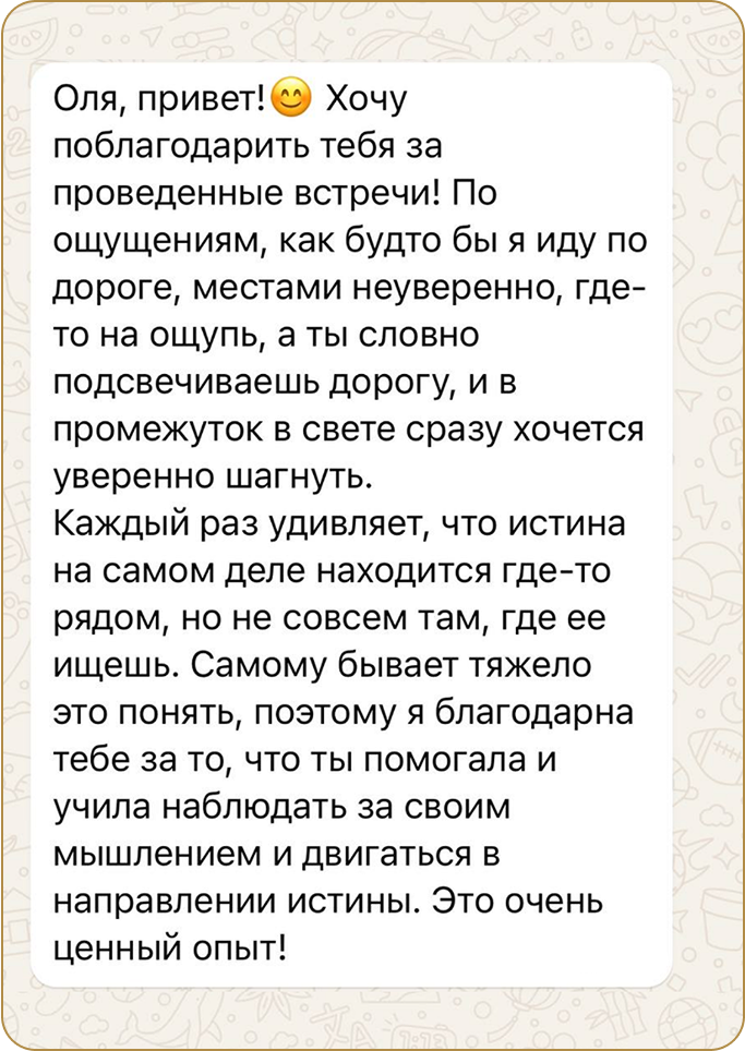 В индивидуальную коучинговую программу «Прорыв» можно попасть только записавшись на первую бесплатную ознакомительную сессию по кнопке на сайте или отправив личное сообщение на WhatsApp +7(917)352-02-22 или Telegram @olgant81.