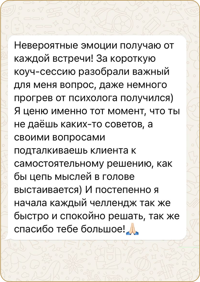 На первой ознакомительной сессии мы договариваемся о дне и времени наших еженедельных онлайн встреч, я высылаю договор. После подписания договора и оплаты я за 5 минут до начала каждой встречи высылаю ссылку для подключения в ЯндексТелемост. В промежутках между встречами, при необходимости мы ведем переписку в удобном для вас мессенджере WhatsApp или Telegram.