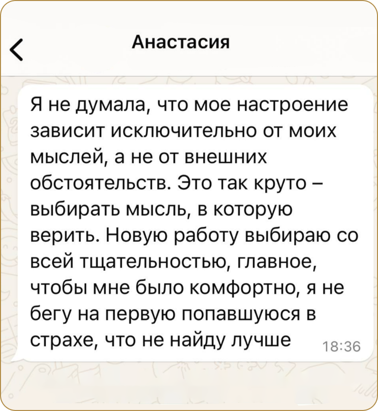 Приобретение навыков наблюдения и управления своими мыслями. Ты освоишь самый главный инструмент работы со своим мышлением, который позволит тебе отделять факты от мнений, наглядно видеть к каким последствиям приводят твои привычные мысли. Ты обретешь свободу выбирать свою реакцию на внешние обстоятельства, а не двигаться по «накатанной дорожке».