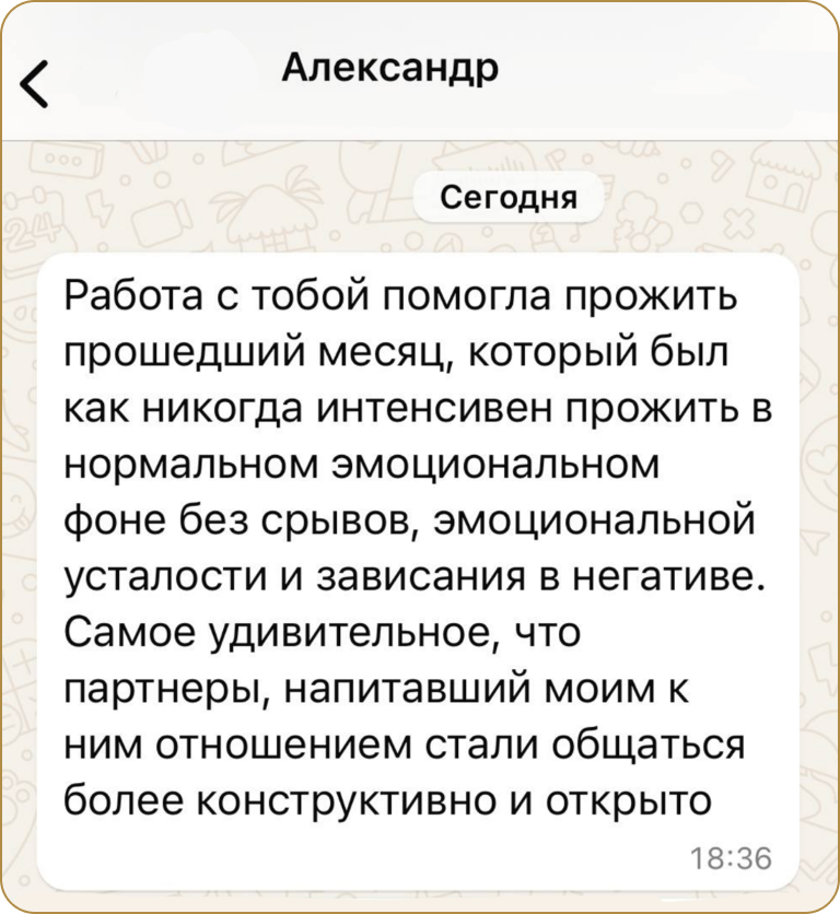 Эмоциональная саморегуляция. Ты освоишь навык проживания своих эмоций безопасно для себя и окружающих: не заталкивая эмоции внутрь себя, не избегая их, не срывая их на других и не компенсируя едой, алкоголем или интернетом. Ты сможешь выйти из-под власти эмоций и реагировать из спокойного состояния.